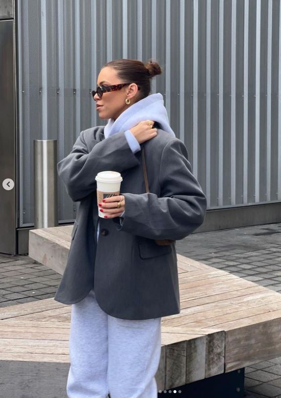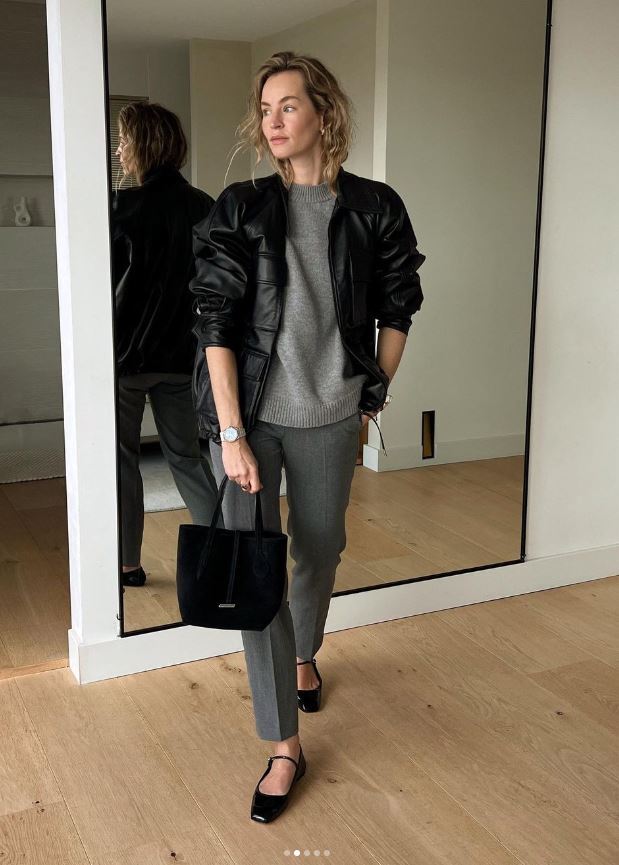 와이드핏 그레이 슬랙스에 스니커즈로 캐주얼한 하의지만 어깨선 딱 맞는 정핏 재킷에 토트백을 들어 무드를 중화시켜줬어요