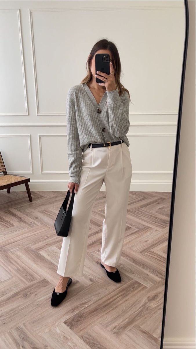 청바지에 앞을 살짝 찔러 넣으니 캐주얼한 무드로, 화이트 슬랙스에 블랙 벨트로 무채색 코디를 이어가니 세련된 올드머니 룩이 됩니다