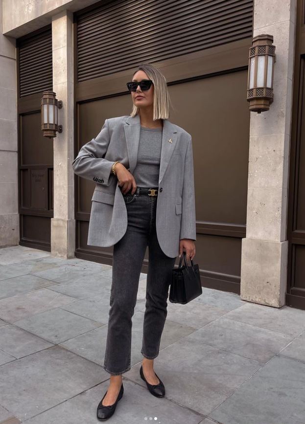 청바지에 흰 티, 적당한 오버핏 그레이 재킷을 걸치고 플랫 슈즈를 신어 주니 무난한 데일리룩이죠