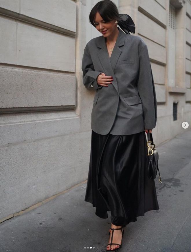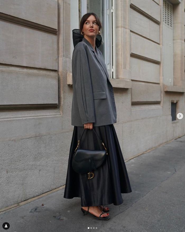 실키한 롱스커트에 매니시한 오버핏 재킷, 스커트만 보면 드레시해 보이는데 그레이 재킷으로 무드를 눌러 주니 룩이 담백해졌습니다