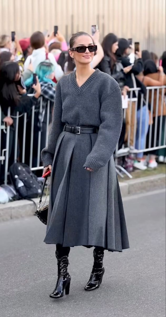 그레이 니트에 그레이 스커트를 완전히 깔맞춤해 코디하니 마치 원피스처럼 보입니다